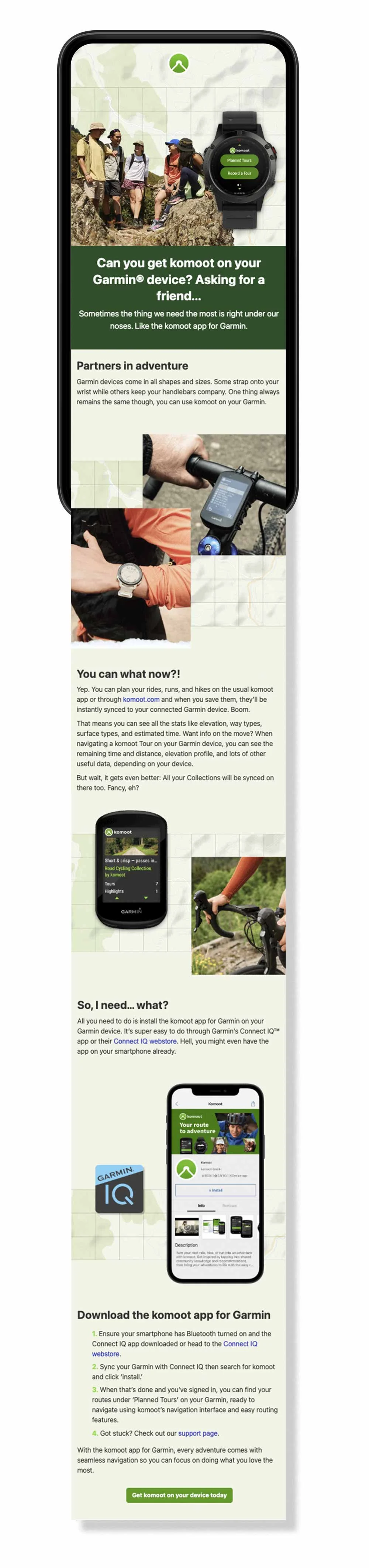This email went out to everyone with a Garmin connected to their komoot profile, letting them know about the komoot app specifically built for their Garmin device. I pushed our open rates from 35% to over 50% for Garmin-based comms.